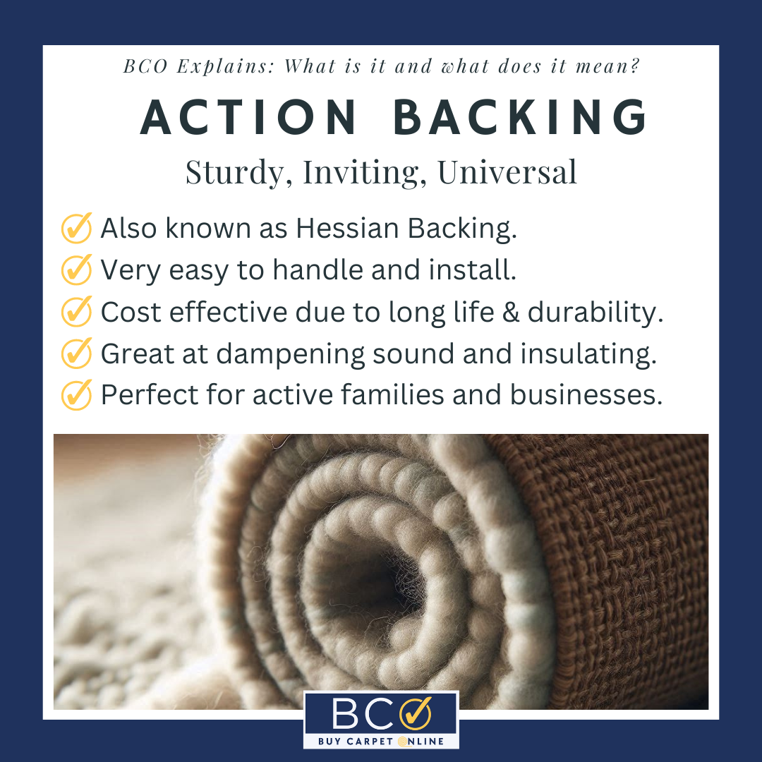Action, or hessian backing as it is also known, is a sturdy choice. Unlike felt, action backed carpets are recommended to be used with underlay to give a softer, more comfortable feeling underfoot.