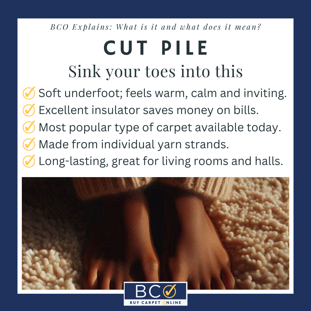 The individual yarn strands of cut pile carpet create a soft, plush surface that feels great underfoot. Some say it's softer than loop pile carpets because your toes can sink further into the fibers.