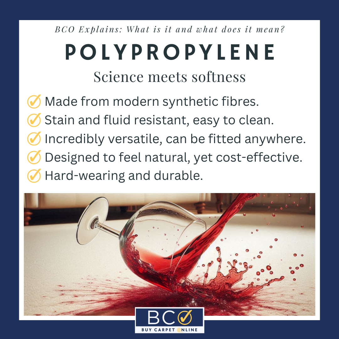 Polypropylene is a synthetic fiber that lends itself perfectly to carpets due to its exceptional performance characteristics: Durability, Stain Resistance, Affordability, and Low Maintenance.