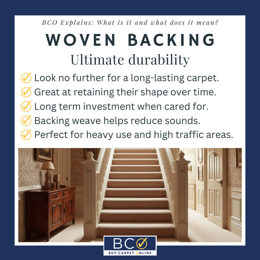 Woven Back Carpets are a type of carpet that features a primary backing woven directly into the carpet pile, eliminating the need for a secondary backing (like hessian or felt).