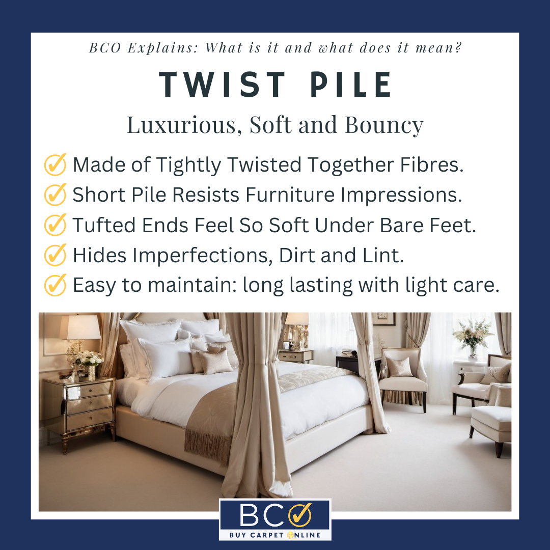 Twist pile carpets have tightly twisted fibres, resulting in a luxurious, springy, and textured surface. The short pile provides a firm but comfortable underfoot feeling, while the densely packed fibres mean there's less chance of flattening. The tufted ends of the fibres create a plush feel that's perfect for bare feet.